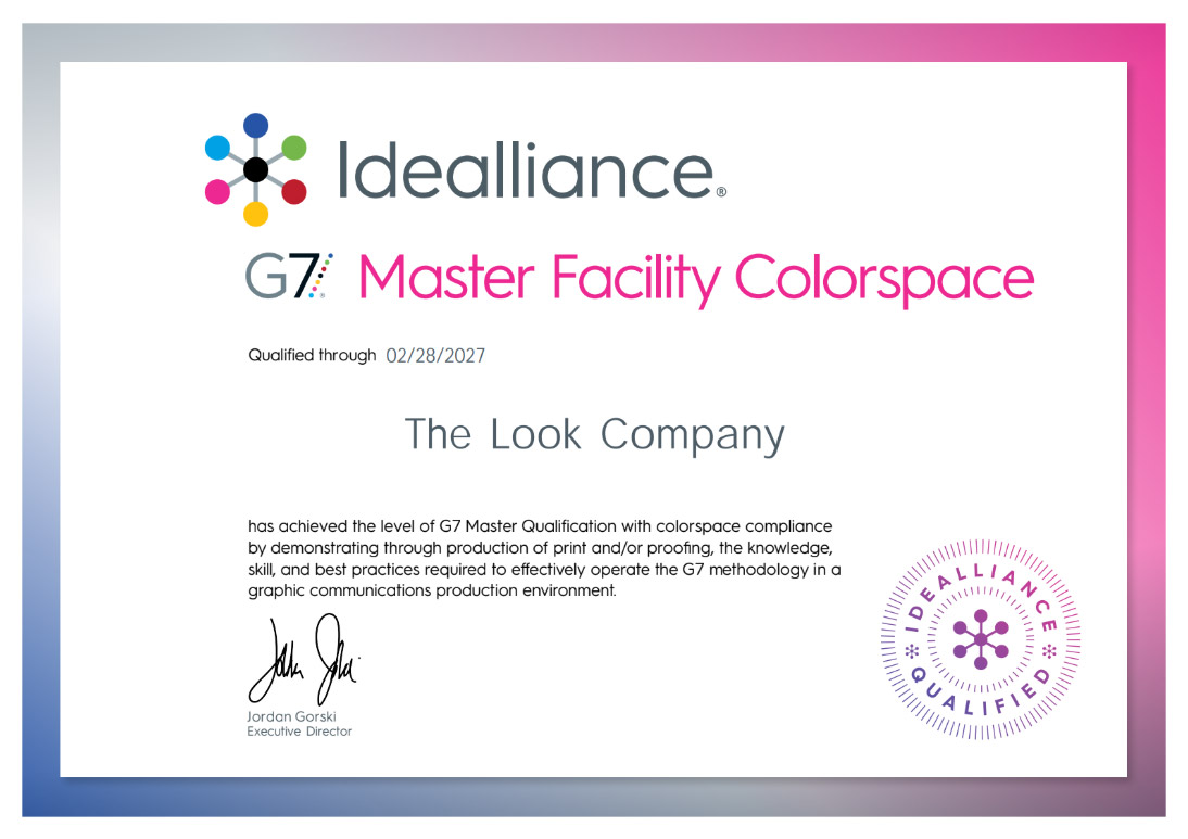 This certification marks the culmination of a multi-year effort to achieve the industry’s highest standards for color management and print validation. The Look Company previously achieved G7 Grayscale compliance, followed by G7 Targeted certification in 2022.